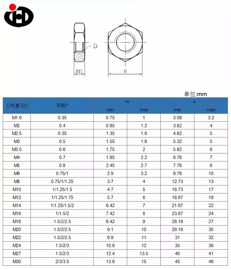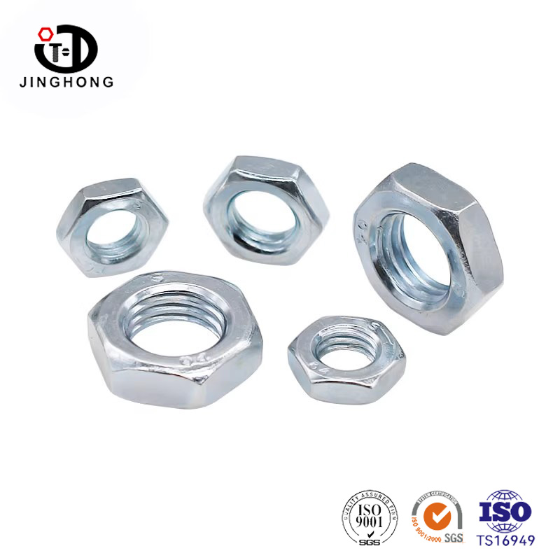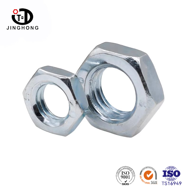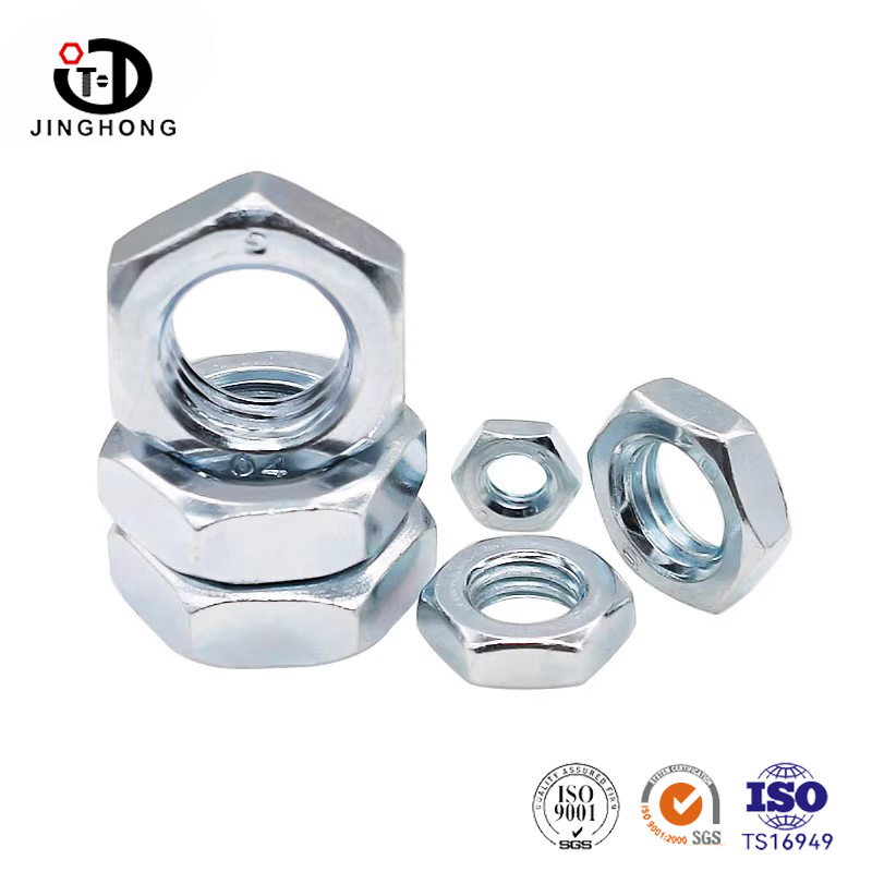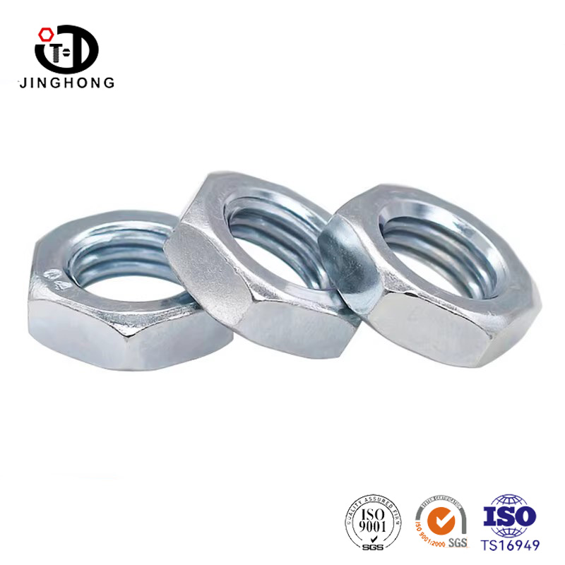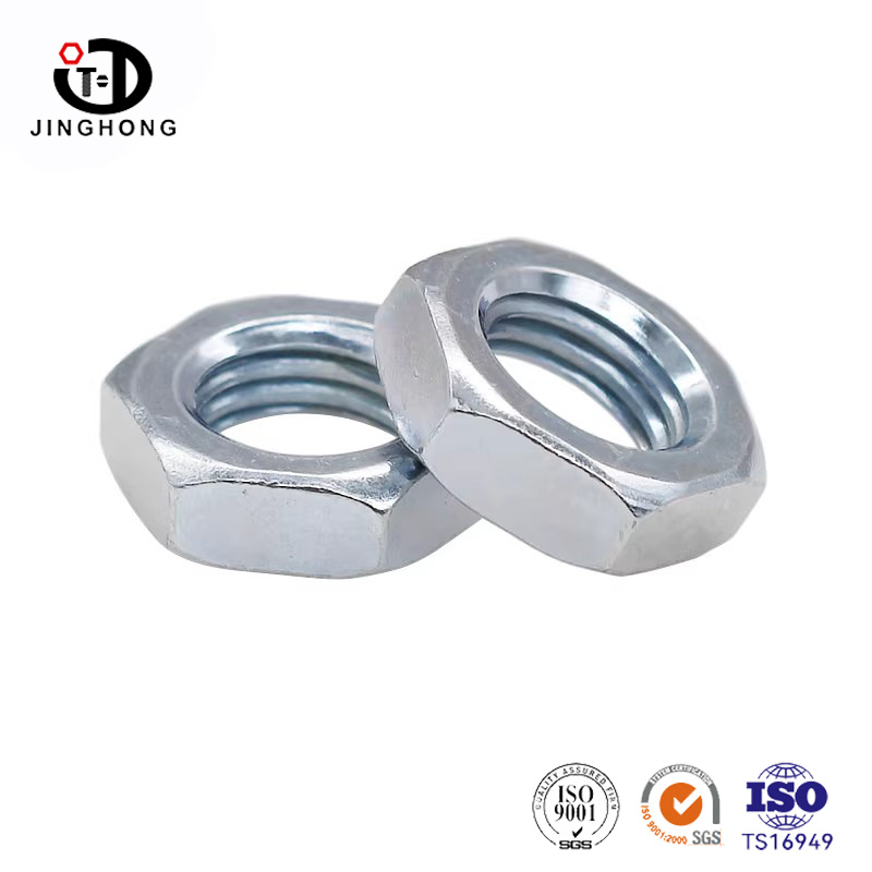 The DIN439 hexagonal thin nuts from Jinghong factory are hexagonal nuts with significantly reduced height, and their thickness is less than half of the standard nuts of the same specification. This "thin" design can handle assembly with limited space. When the bolt length is limited, the thin nut can provide sufficient thread engagement. When double nut locking is required, the thin design makes the space more spacious. When weight reduction is needed, it can effectively reduce the structural weight.