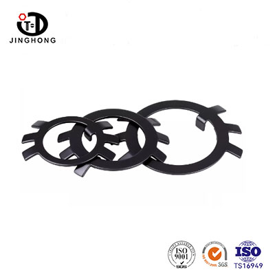 The locking washer used with the round nuts produced by Jinghong Fasteners complies with the Russian national standard GSOT-11872. It is a special locking ring specifically designed for use with round nuts (such as GOST 11871), and is typically used in conjunction with the round nuts to prevent the nuts from loosening under vibration or impact loads. The ring is made of spring steel (65Mn), and undergoes heat treatment and surface anti-corrosion treatment. It is suitable for scenarios with extremely high requirements for anti-loosening reliability, such as heavy machinery, military equipment, and rail transportation.