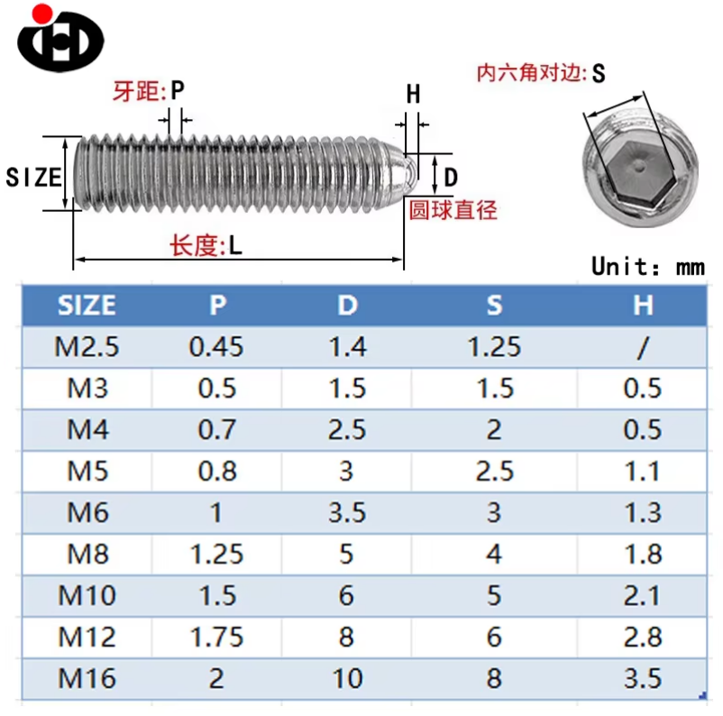SS304 Hex Socket Ball Plunger Set Screw Spring-Loaded, with specifications ranging from M2.5 to M16, are elastic positioning fasteners that incorporate an internal spring and steel balls. They utilize the internal spring to provide elastic tension, enabling the positioning, limiting, retarding, and dividing functions for workpieces. They also possess elastic buffering and locking functions, and are widely used in various mechanical, mold, and automated equipment for precise positioning scenarios.