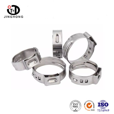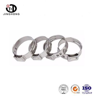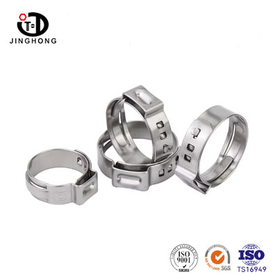 The single-ear hose clamp is an integrated flexible pipeline fastening connection component made of high-quality stainless steel. It achieves permanent locking through the compression deformation of the single ear. The entire product has no interfaces or gaps and can provide uniform and continuous clamping force to hoses and pipes. It also has the advantages of simple installation, strong sealing performance, and small space occupation. It is an efficient and reliable fastening and sealing component for various fluid pipeline systems. Jinghong Fasteners offers a complete range of clamp specifications, suitable for various pipe diameter requirements.